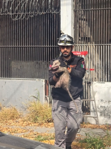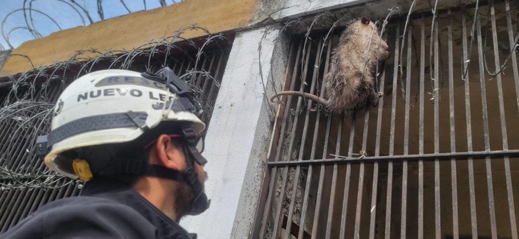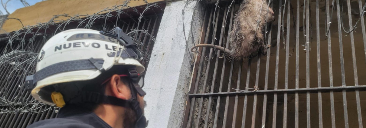 Elementos de Protección Civil Nuevo León atendieron el reporte ciudadano sobre un tlacuache que se encontraba atrapado en una reja de aproximadamente 2.5 metros de altura, enredado en un alambrado de púas en el cruce de las calles General Carlos Salazar y Platón Sánchez, en la colonia Centro del municipio de Monterrey.