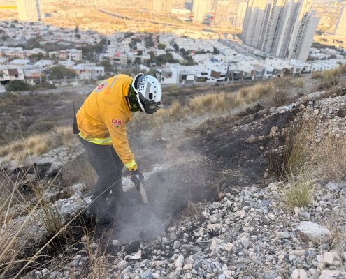 Protección Civil Nuevo León atiende incendio de pastizal en el centro de Monterrey